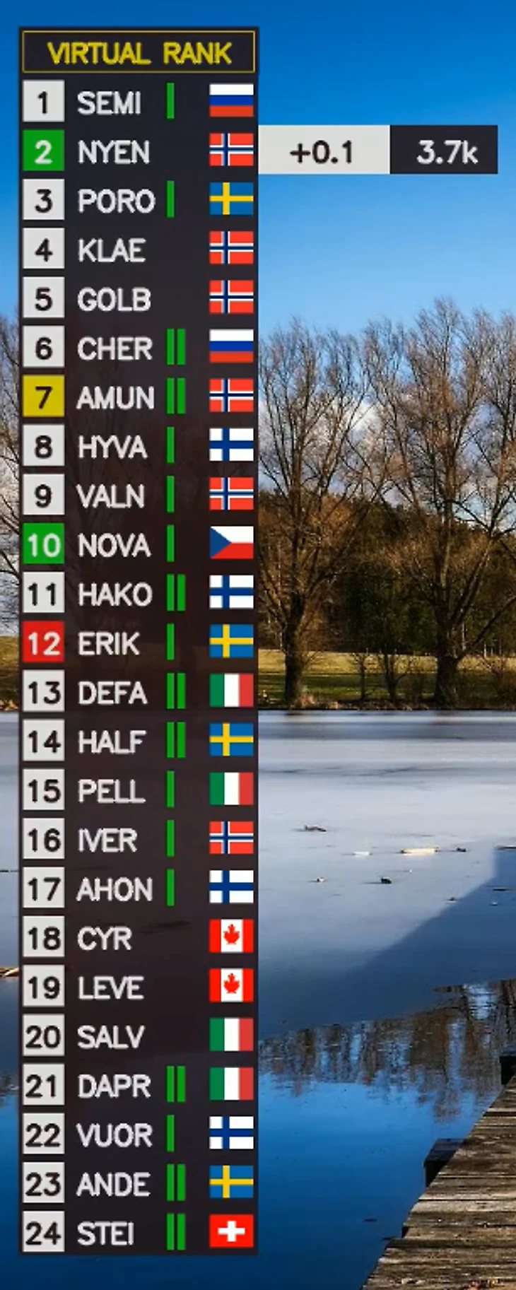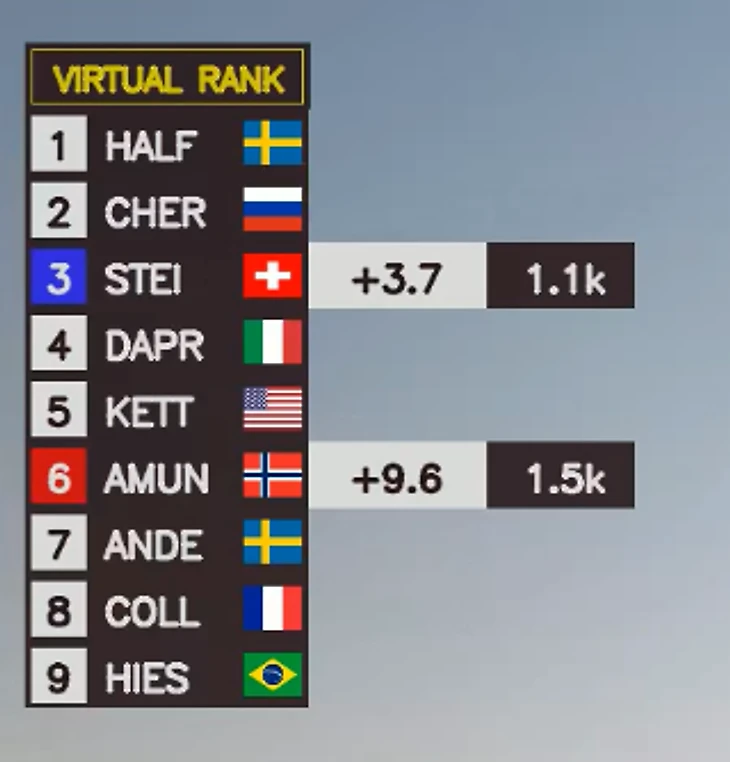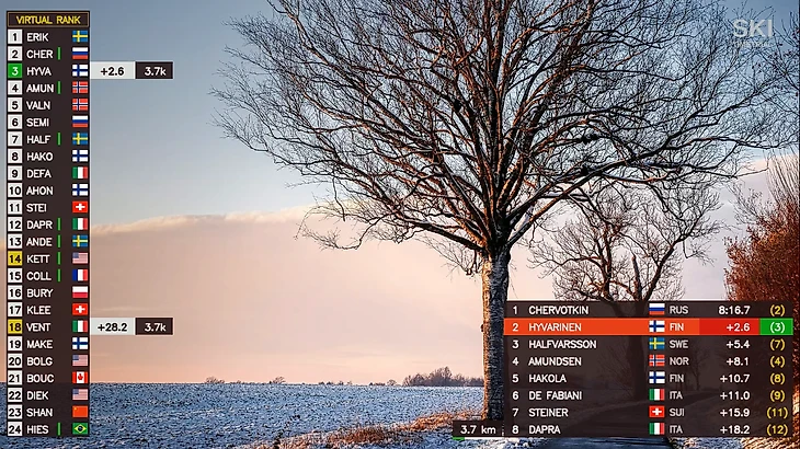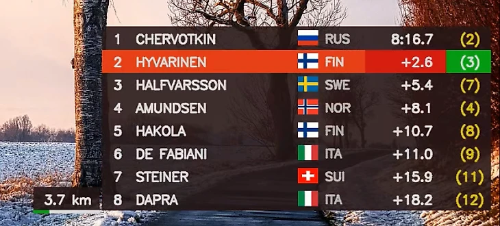 Слева - панель виртуального рейтинга. Она обновляется в прямом эфире после каждого пересечения какой-либо отсечки каким-либо спортсменом. Место в рейтинге дублируется справа на панели результатов. Из предыдущих картинок мы можем заметить, что Пертту Хюваринен после прохождения отсечки 3.7 км поднялся с 4-й на 3-ю позицию в рейтинге. Об улучшении рейтинга сигнализирует зелёный цвет индикатора. Также мы видим, что рейтинг Калле Халфварссона ниже, чем у Харальда Амундсена, несмотря на то что он впереди норвежца на отображаемой отсечке. Это значит, что на более поздних отсечках между ними произошла рокировка.