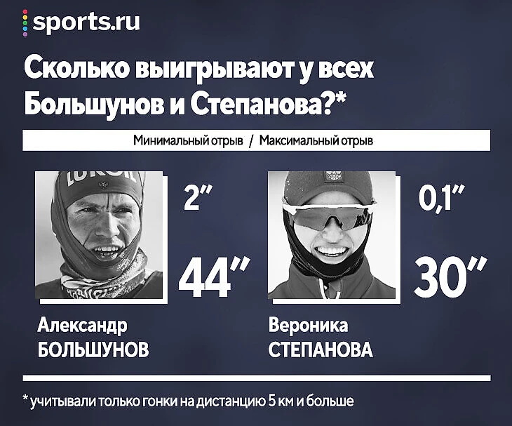 Самый спорный пункт. В лыжных гонках невозможно напрямую сравнивать результаты: каждый раз они зависят от профиля трассы, скольжения и еще массы факторов. Но цифры отрыва дают хотя бы примерное представление об уровне.