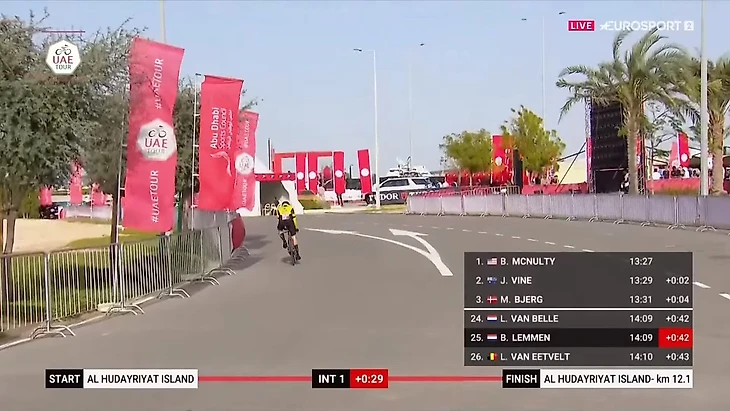 Вернусь к позитивным изменениям. Они есть и в велоспорте. Там трансляции гонок на время также нуждаются в улучшениях. Пример таких улучшений – новая графика для гонок, организуемых RCS Sport, которая впервые появилась на Туре Эмиратов. Результаты на отсечке теперь более подробные, и они всегда сопровождаются данными с предыдущих отсечек, оформленными уже в знакомом нам виде.