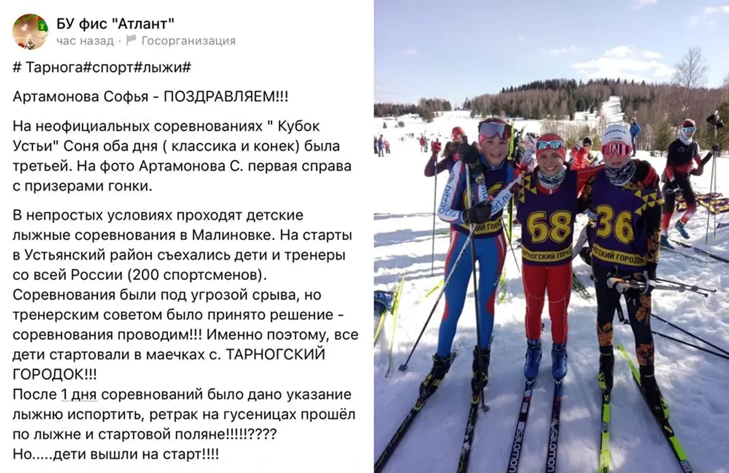 ● Дети и тренеры, не согласовав ни с кем свои действия, пришли на стадион и стали проводить гонки. Далее цитата: «Наплевали на все запреты, соревнования были проведены. В соцсетях их попытались назвать тренировкой, но сами лыжники начали выкладывать фото и комментарии в сеть и демонстрировать победы на Кубке Устьи».