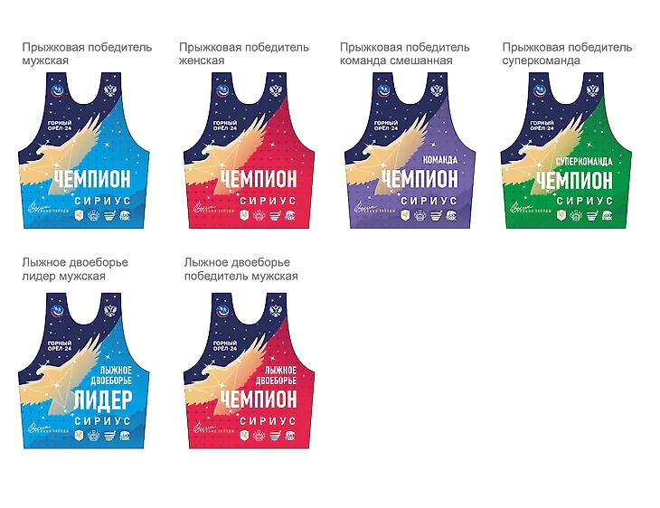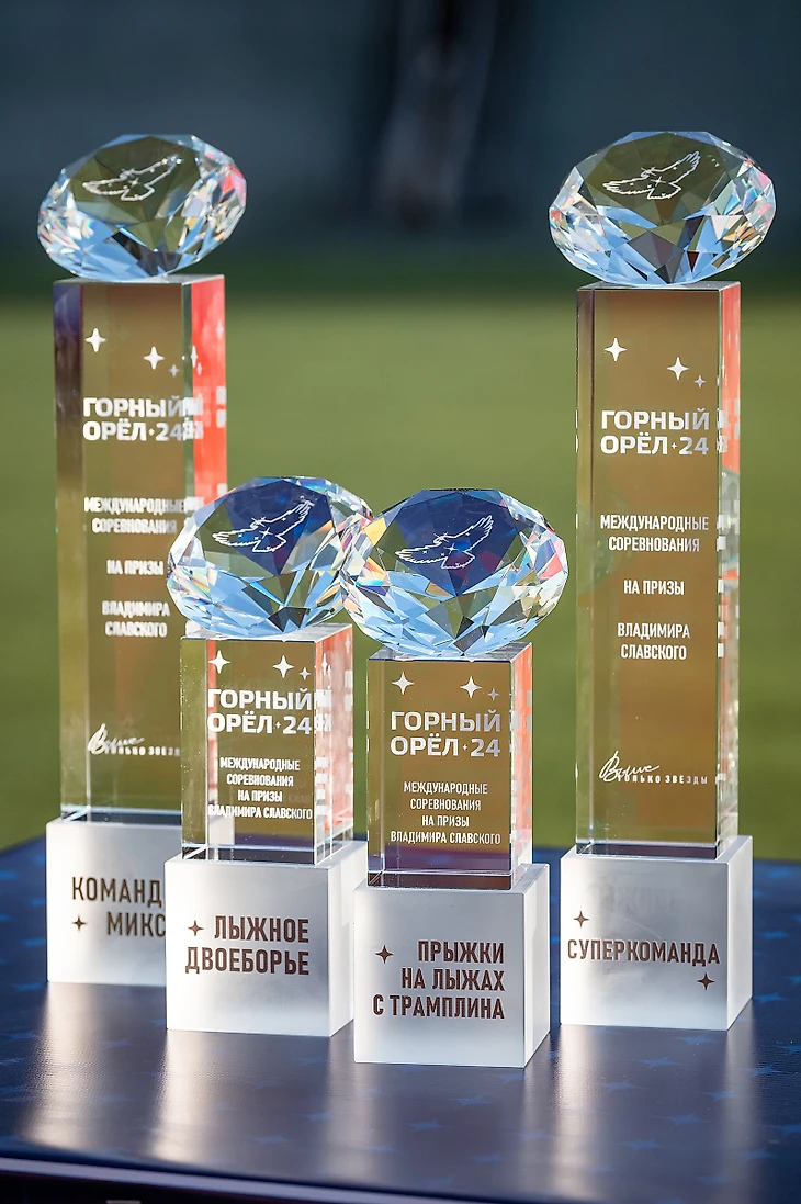 Уже год, с первого «Горного орла», который прошел в 2023 году за визуальную составляющую отвечает пермская компания «ТРЕК», которая занимается производством спортивной экипировки. Вроде бы похожий дизайн для всех спортсменов, но нужно менять цвета – для мужчин и девушек, для двоеборцев (у которых есть отдельно гонка, отдельно прыжковая часть), для команд, лидеров, победителей, в этом году для суперкоманд…Кстати, в этом году когда отшили все стартовые майки в аэропорту оказалось, что их почти 100 килограмм! Потом. когда был отрисован Орел с созвездием внутри его начали переносить на оформление спортобъекта (а это сотни метров «визуализации»), на медали (за это спасибо пермской компании К.М.С.) и на хрустальные трофеи (которые произвела компания «Награды Всем»). Украшенные подобием огромного бриллианта, переливающиеся они наделали фурор в социальных сетях еще перед стартом.