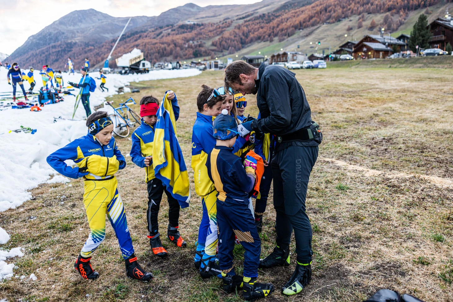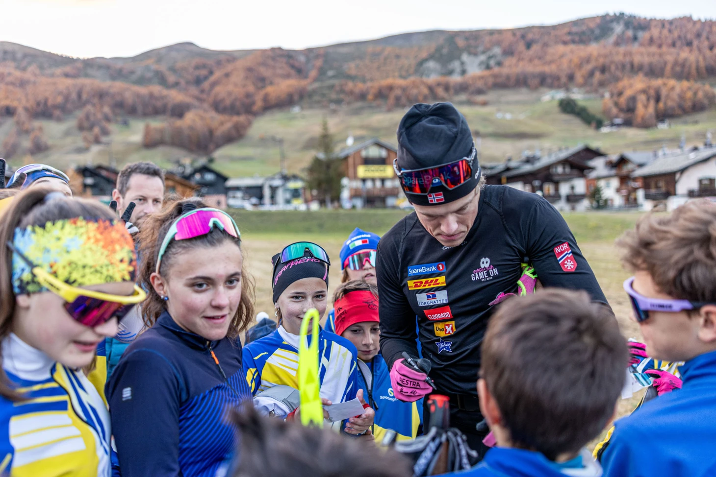 На небольшом снежном пятне среди гор Нортуг и Клэбо встречают итальянских детей. Бок о бок они подписывают фотографии и делают селфи.