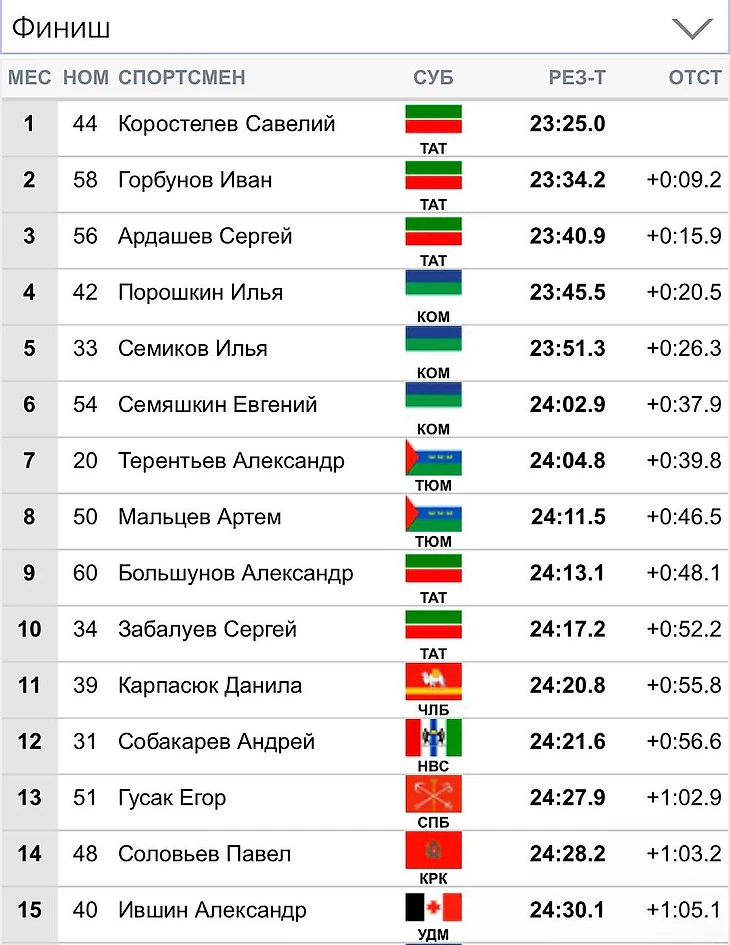 1. Савелий Коростелев — 23.25,0 2. Иван Горбунов — +9,2 3. Сергей Ардашев — +15,9 4. Илья Порошкин — +20,5 5. Илья Семиков — +26,3 6. Евгений Семяшкин — +37,9 7. Александр Терентьев — +39,8 8. Артем Мальцев — +46,5 9. Александр Большунов — +48,1 10. Сергей Забалуев — +52,2…