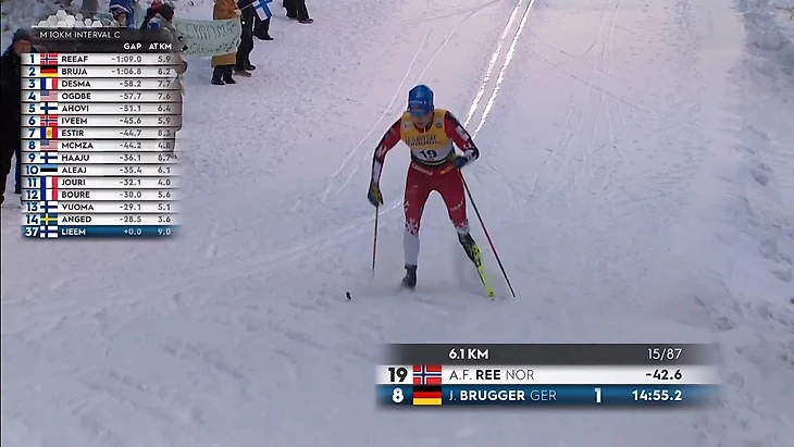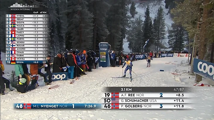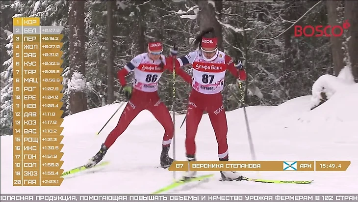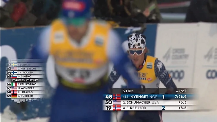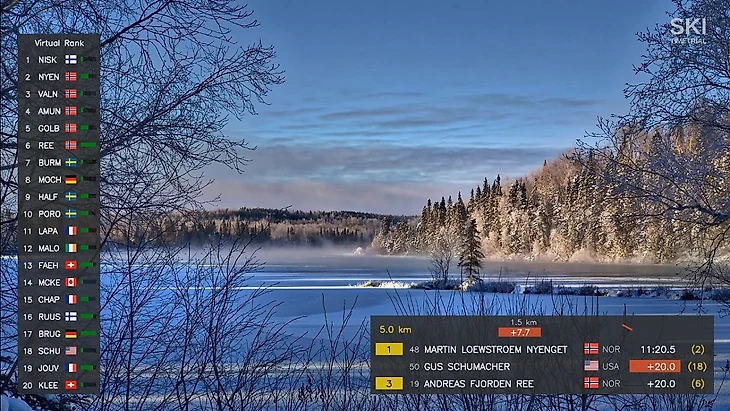 Напоследок – о других новшествах. Теперь при показе лыжников, проходящих отсечку, всплывает информация о том, кто только что отправился в гонку и кто будет стартовать следующим. Это полезное нововведение, оно позволяет меньше засиживаться на старте, чем так грешат режиссёры, и больше внимания уделять отсечкам. Иногда к такой графике в маленьком окошке добавлялось видео старта лыжников. Тем не менее, показ стартовой зоны всё равно был избыточным.
