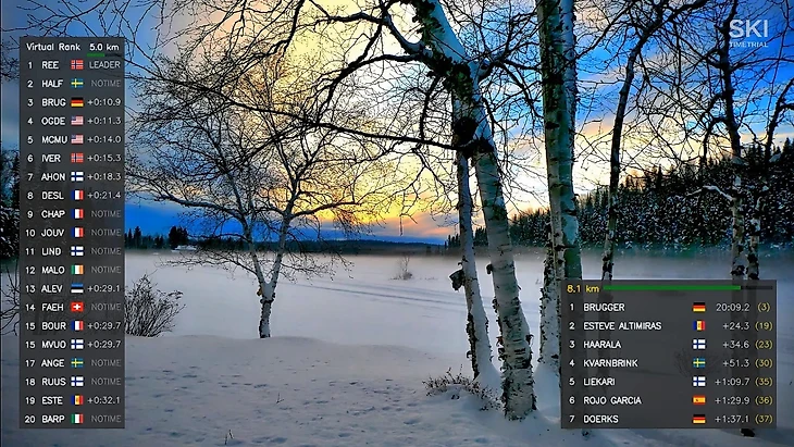 На картинке видно, что половина отображаемых спортсменов преодолели только первую отсечку в 1.5 км, а другая половина уже прошла 5.0 км. Первая половина ранжирована между собой по данным с отсечки 1.5 км. Вторая половина ранжирована между собой по данным с отсечки 5.0 км. Последнее хорошо видно на следующей картинке (видео перемотано примерно на минуту вперёд), где представлена вторая форма отображения виртуального рейтинга.