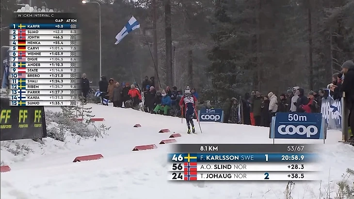Пример четвёртый. Виктория Карл, пробежавшая 7.5 км, идёт 5-й в виртуальном рейтинге FIS. Это завышенная позиция: она прошла меньшую часть дистанции по сравнению с соперницами и ещё не успела достаточно сильно отстать от Фриды Карлссон. Фактически Карл бежит по 8-9-му месту (9-е время на отсечке 6.5 км, 8-е – на 8.1 км).
