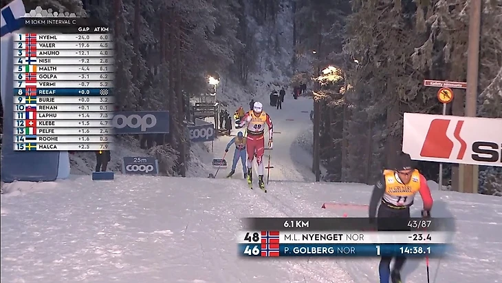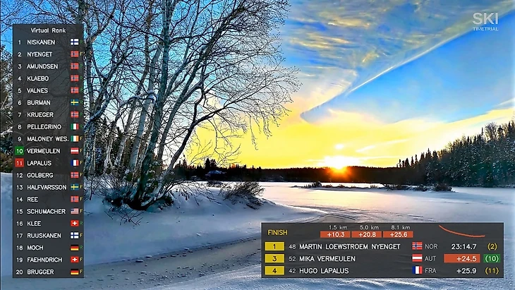 Я упоминал, что в рейтинге FIS Ииво Нисканен на первой трети своей гонки был лишь 4-м, хотя опережал графики всех конкурентов. Как обстоят дела у меня? Всё в порядке: примерно в тот же момент гонки он первый.