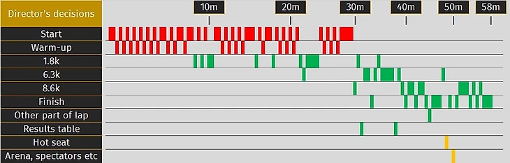 Это привело к тому, что я решил написать программу, которая имитировала бы работу режиссёра в гонке с раздельным стартом, то есть выбирала, какого спортсмена показывать в тот или иной момент времени. Было это в ноябре 22-го года. Весь мой интерес был связан только с этой задачей, никаких принципиально новых идей в области графики, которая почти не менялась чуть ли не с момента зарождения лыжных трансляций (если говорить о её содержательной части, а не о визуальной), у меня изначально не было.