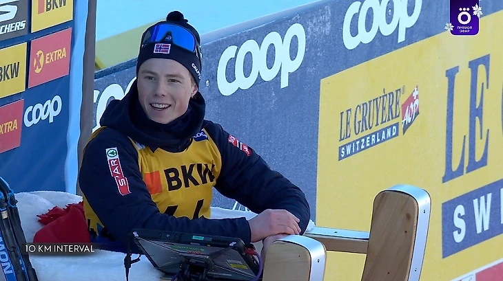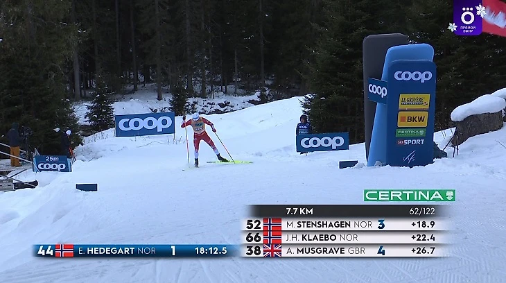 Клэбо прошел отметку 5 км. Пока третий в 3,5 сек от Эйнара Хедегарта. Первые семеро – норвежцы.