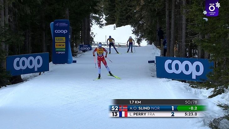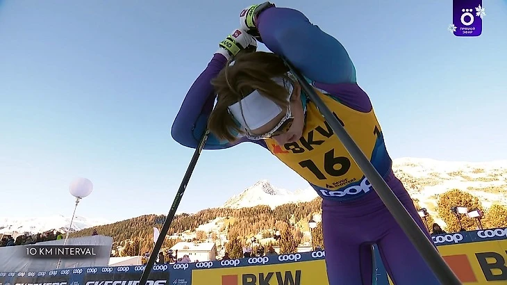 На отметке 1.7 км Непряева пока 4-я, отставание от лидера – француженки Перри – 10,2 секунды.
