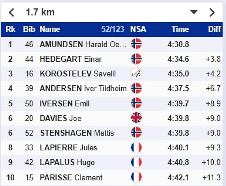 Амундсен и Клэбо начали с лучшим разгоном. На 1.7 км после всех лидеров время Коростелева остается 4-м.