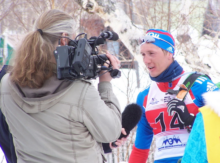Победитель марафона Егор Сорин даёт интервью.