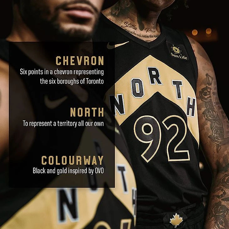 Форма выполнена в классическом для лейбла стиле: основной черный цвет и золотые визуальные элементы. На лицевой стороне дизайнеры разместили слово «North». Также под стиль формы была переделана площадка «Торонто». В регулярном чемпионате «Рэпторс» в этой форме сыграют несколько домашних матчей.