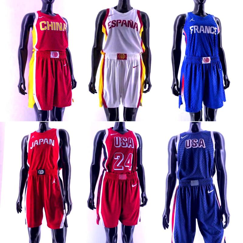 2 комплекта формы сборной США по баскетболу выполнены в привычных цветах – красном и синем. На форме дизайнеры использовали шрифт в ретро стиле, который сопровождается звездой на боковой части шорт – классического атрибута баскетбольной сборной данной страны.