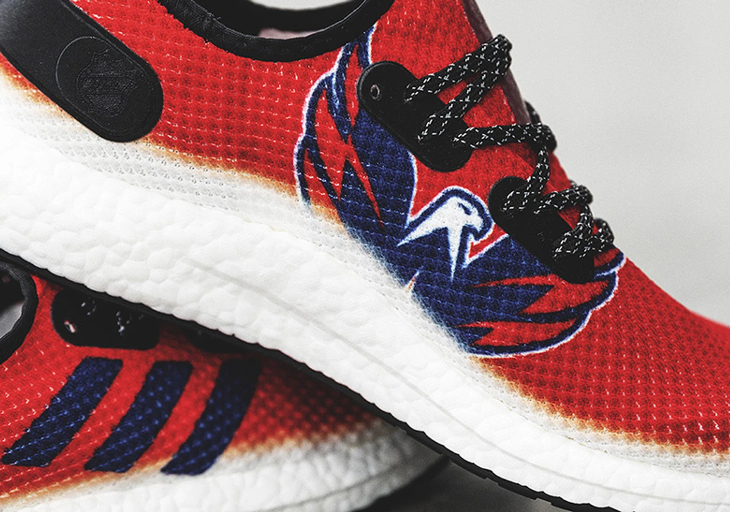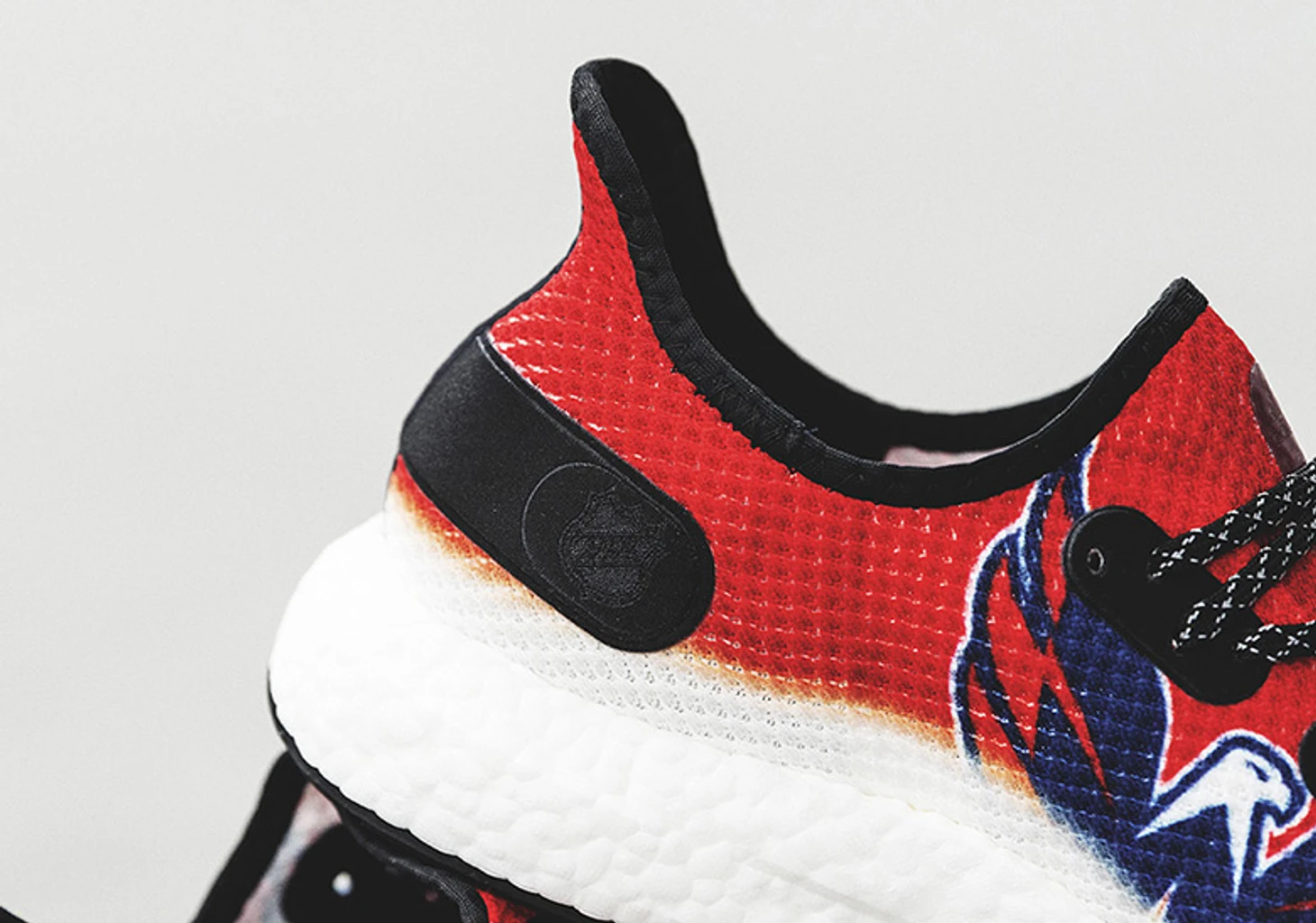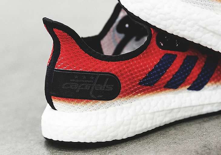 Модель исполнена в цветах «Кэпиталз». На внешней части кроссовка изображен логотип команды, на внутренней символ бренда – три полоски. На пятке пришит патч с логотипом НХЛ и надписью «Вашингтон Кэпиталз».