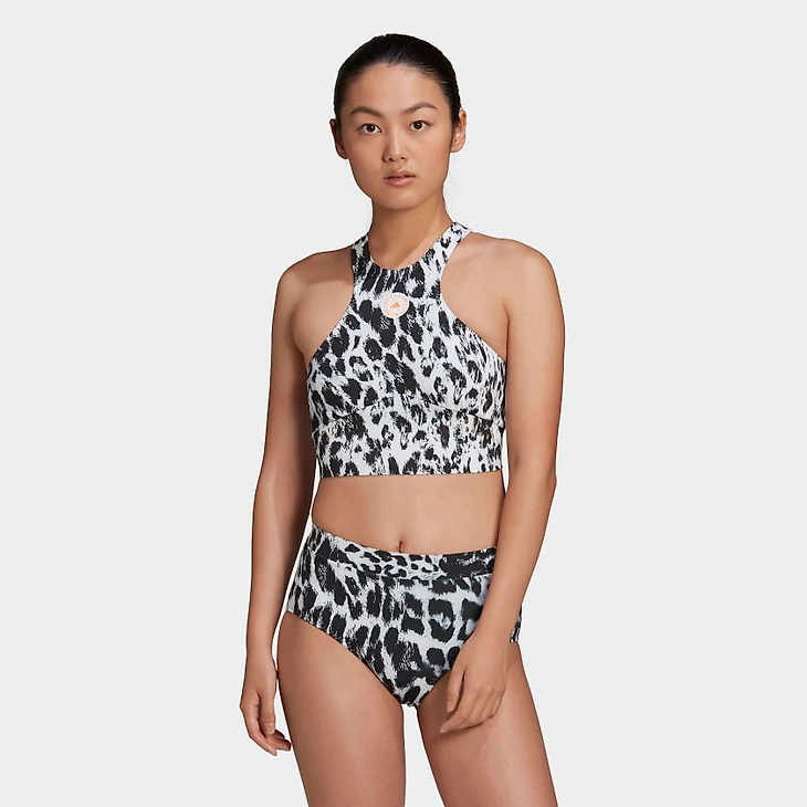 Бикини-топ с перекрестными лямками от Стеллы Маккартни. Стильный верх купальника, комфортный, чашки слитные, на что нужно обращать внимание при выборе. Именно такая модель будет отлично поддерживать грудь. Спинка с перекрестными лямками гарантирует свободу движений в воде. Adidas старается сократить пластиковые отходы, поэтому использует переработанный материал для своих изделий, для этой модели в том числе.