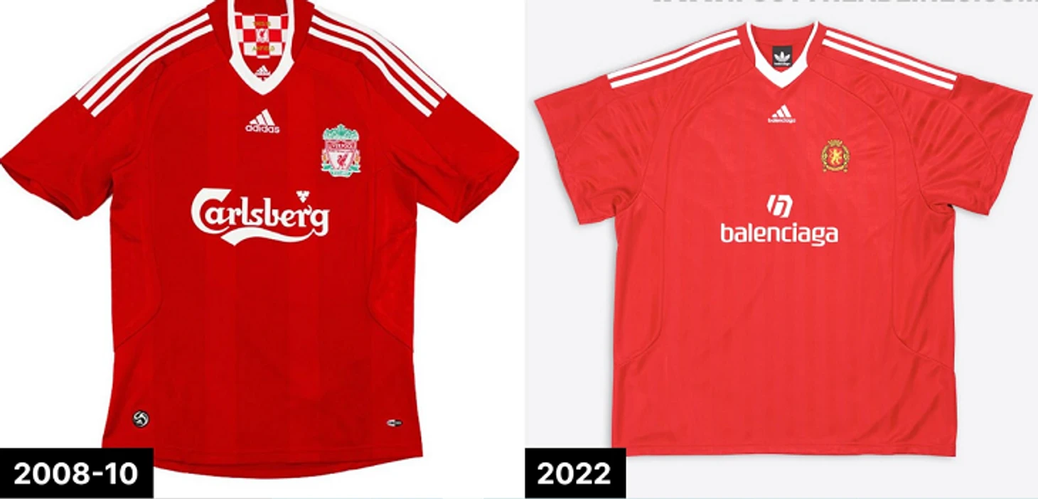 Впрочем, дизайнеры скорее вдохновлялись формой «Ливерпуля» из сезонов-2008/10. Три полоски и логотипы adidas на месте, а вместо памятного Carlsberg теперь надпись Balenciaga.