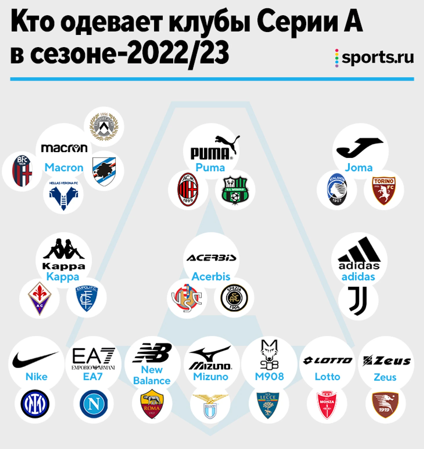 Исключение в основном составляют топ-клубы, которые получают хорошие деньги и индивидуальный дизайн от adidas («Ювентус»), Nike («Интер») и Puma («Милан»). Середняки выбирают бренды поскромнее, где можно рассчитывать на эксклюзив: «Рома» одевается в New Balance, «Аталанта» – в Joma, «Лацио» этим летом запустил в Серию А Mizuno.