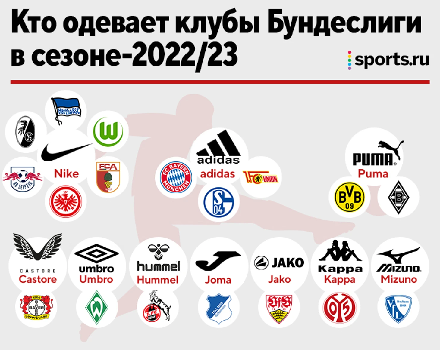 Интересно, что в Германии Nike (6 клубов) чувствует себя уверенее, чем немецкие adidas (3) и Puma (2) вместе взятые. Но бренды из Херцогенаураха крепко вцепились в главные активы лиги – «Баварию» и «Боруссию». Adidas владеет частью акций мюнхенцев, а Puma – акционер дортмундцев. Боссы компаний входят в наблюдательные советы клубов.