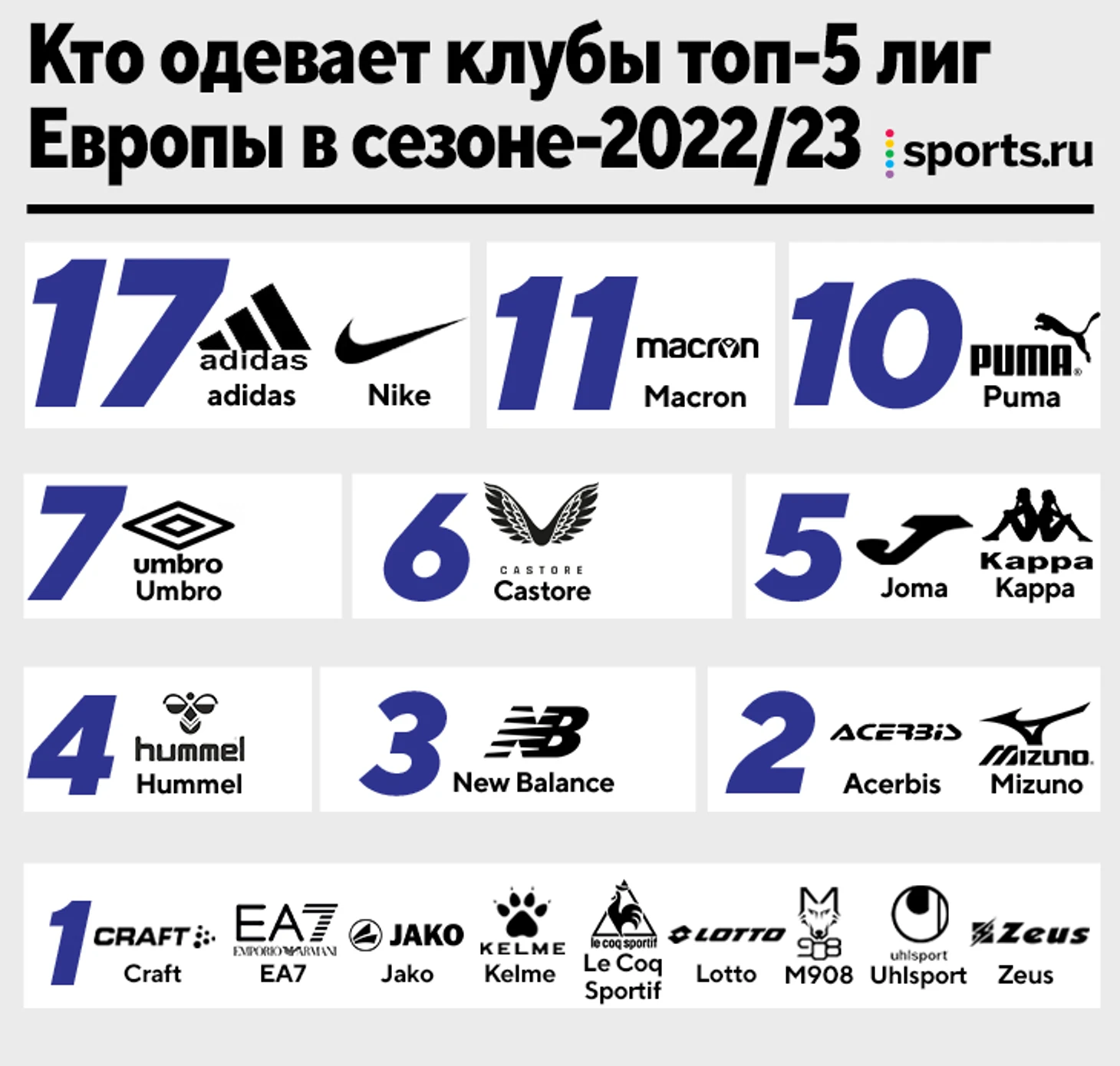 • Лидируют традиционно adidas и Nike – каждая компания одевает по 17 команд. А вот Puma выпала из топ-3, немцев подвинул итальянский Macron.