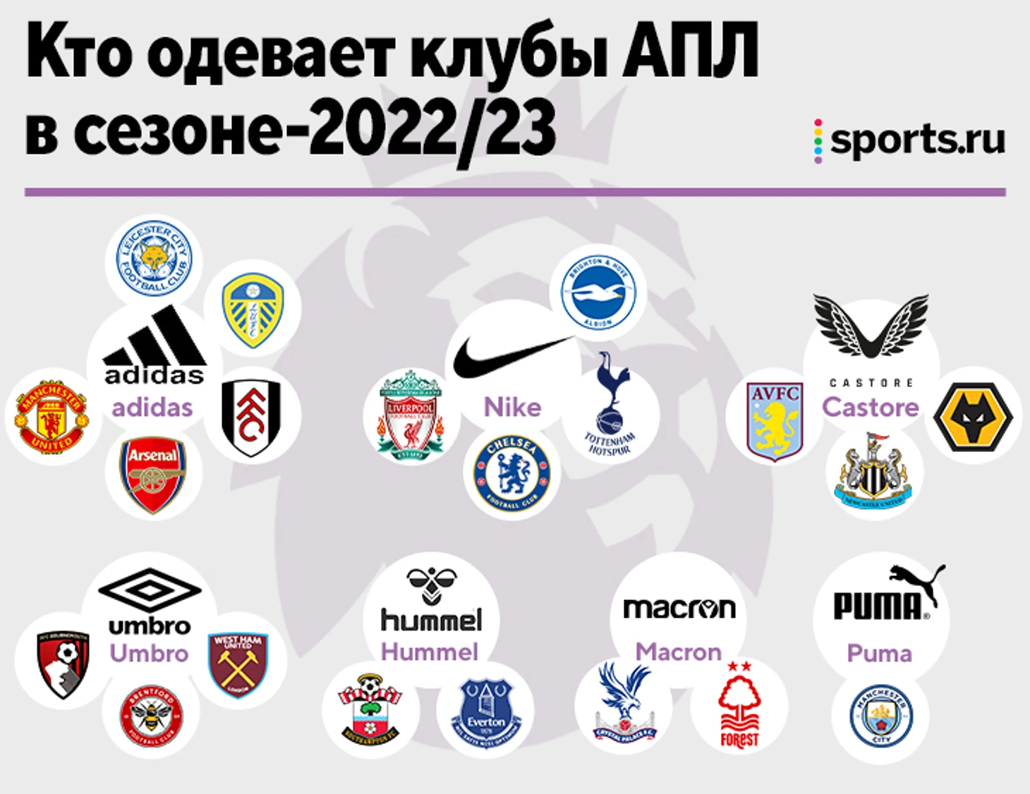 В прошлом сезоне adidas и Nike одевали по 4 команды, но теперь немцы вышли в лидеры за счет поднявшегося в АПЛ «Фулхэма». Зато у Nike одни топы – три команды с участием в ЛЧ.