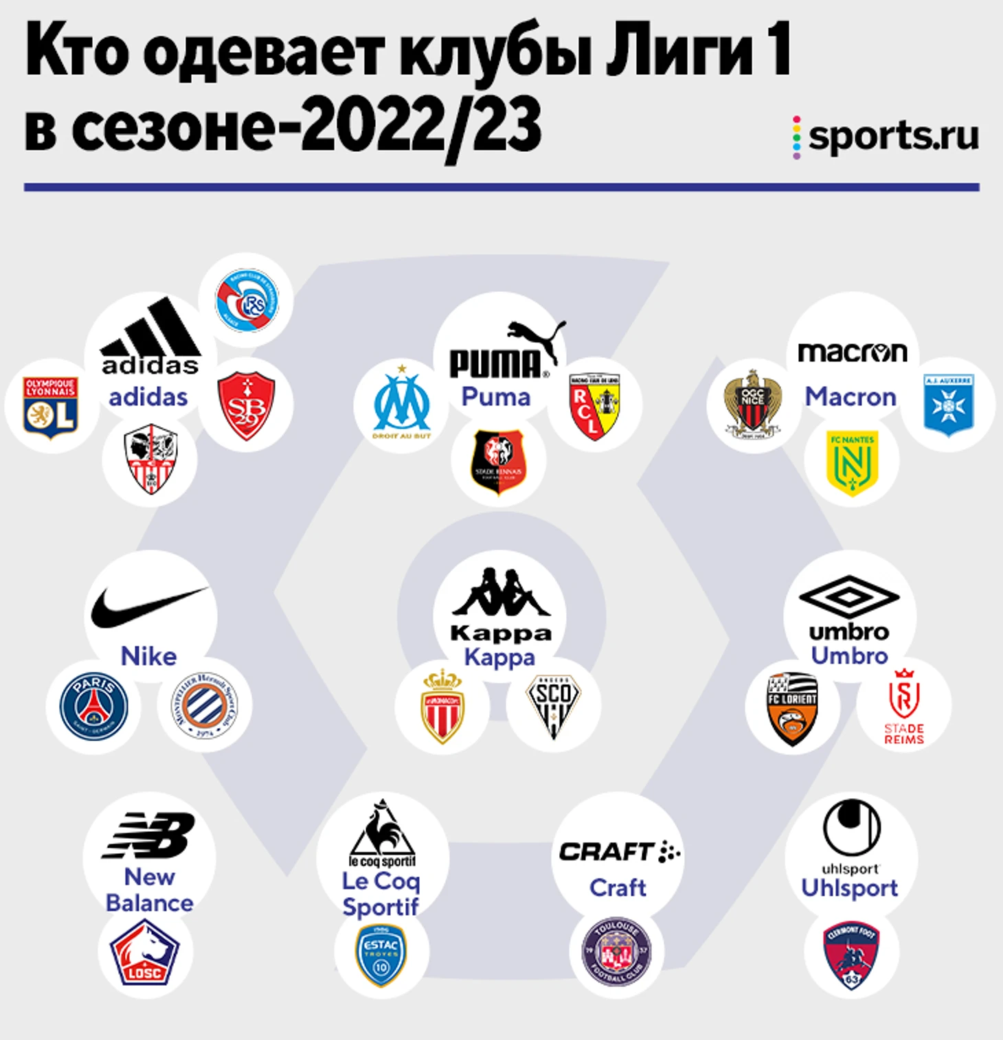 Лига 1 (10 брендов): у Le Coq Sportif остался только «Труа»
