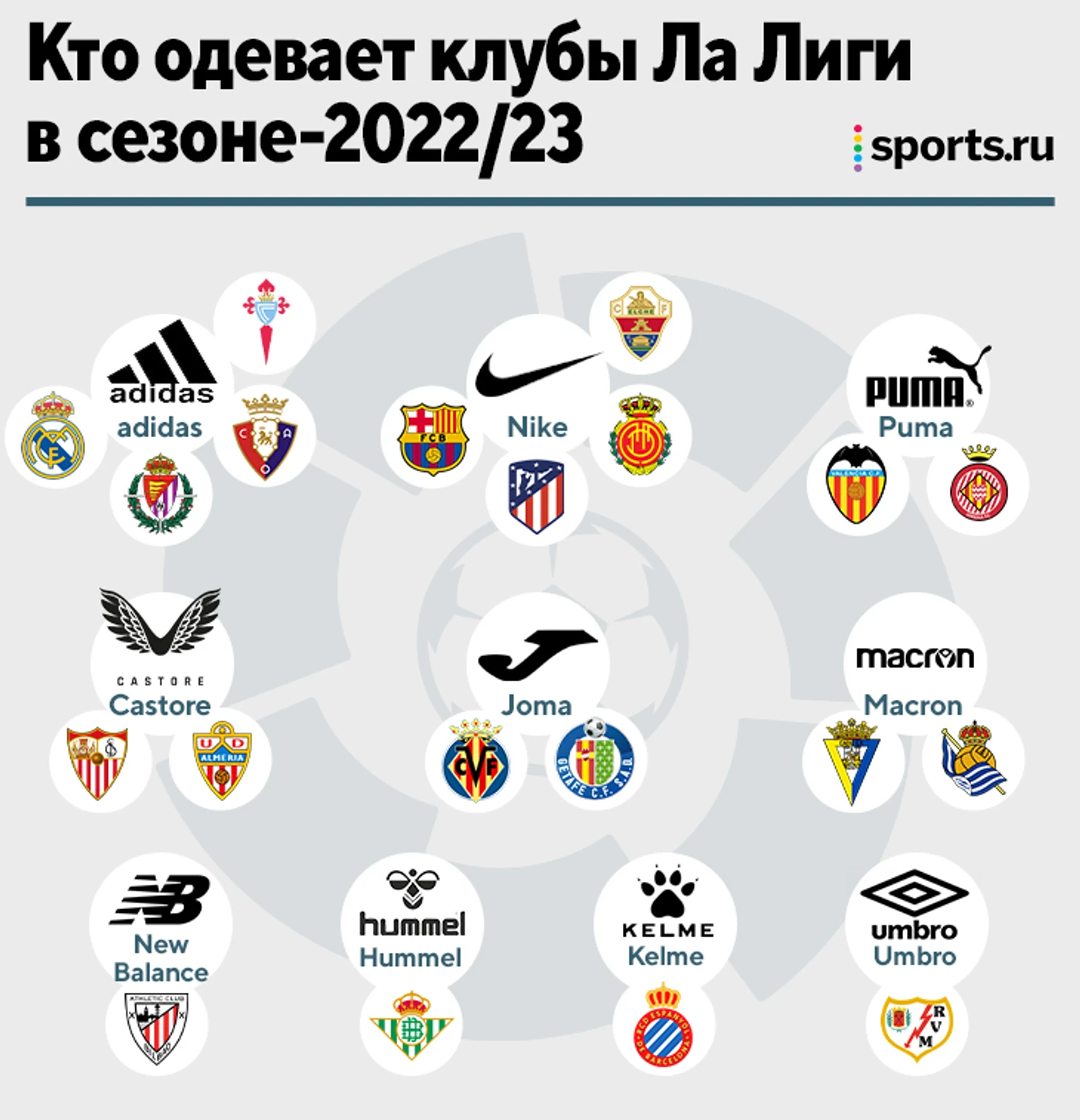 В Испании adidas и Nike сохраняют лидерство – по 4 команды, но у американцев побольше топов («Барса» и «Атлетико» против «Реала»).
