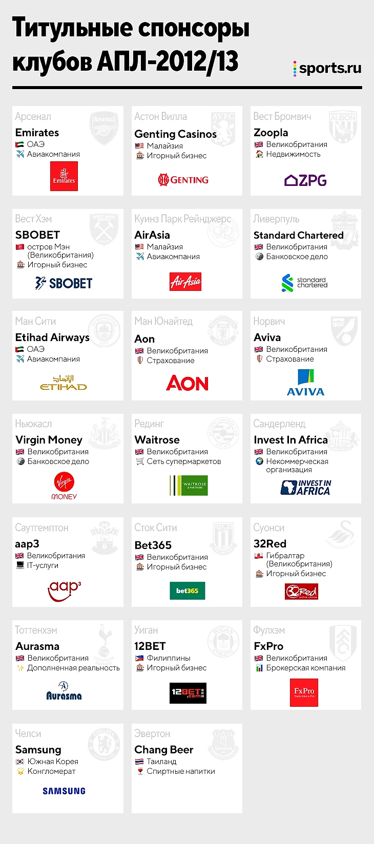 Казалось бы, штаб-квартира спонсора «Ливерпуля» Standard Chartered находится в Лондоне, но в Великобритании банк не имеет отделений, а практически всю деятельность ведет в Азии и Африке. С 2014 года «Тоттенхэм» носит футболки с аббревиатурой AIA – это крупнейшая страховая компания Гонконга. Вслед за Emirates в футбол понесли деньги остальные авиакомпании из Азии – Etihad, Qatar Airways, Turkish Airlines, AirAsia. Если раньше клубы спонсировались европейскими пивоваренными компаниями, то «Эвертон» с 2004 года по 2017-й рекламировал на форме производителя спиртных напитков из Таиланда. И так можно продолжать бесконечно.