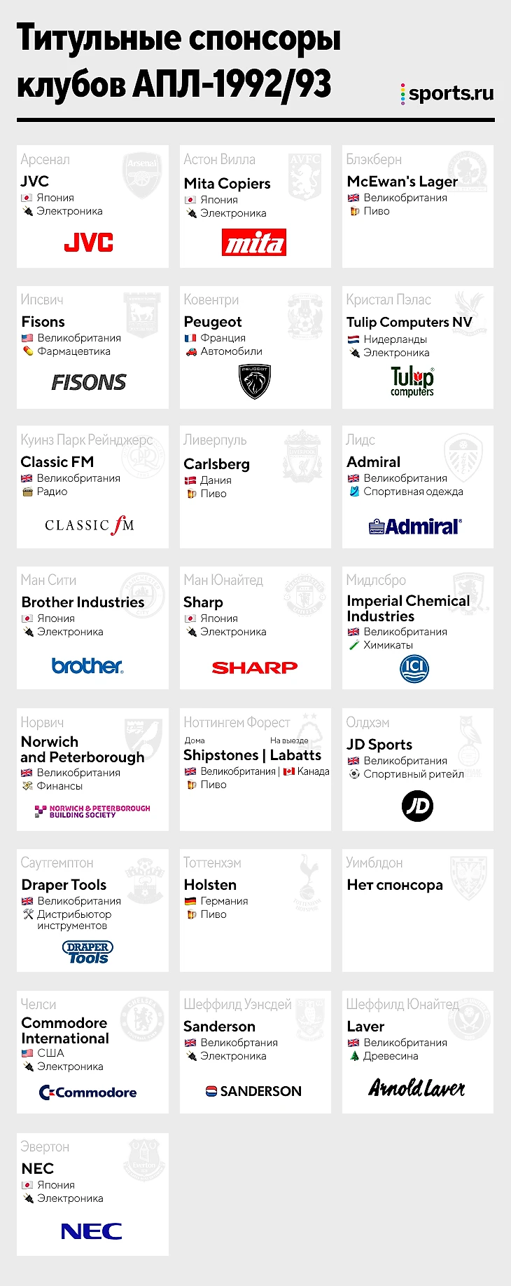 Пивные спонсоры смущали руководство «Арсенала», но находилось много команд, которые без проблем сотрудничали с такой традиционной для британского футбола отраслью. Если в первый сезон АПЛ с японскими производителями электроники работали 5 клубов, то с пивоварнями – 4.