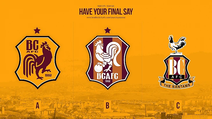 На основе собранных отзывов «Брэдфорд» подготовил два новых дизайна и на прошлой неделе вынес их на голосование болельщиков. Но в отличие от «Астон Виллы», клуб также предложил оставить старую эмблему, которая действует с 1991 года (вариант С).