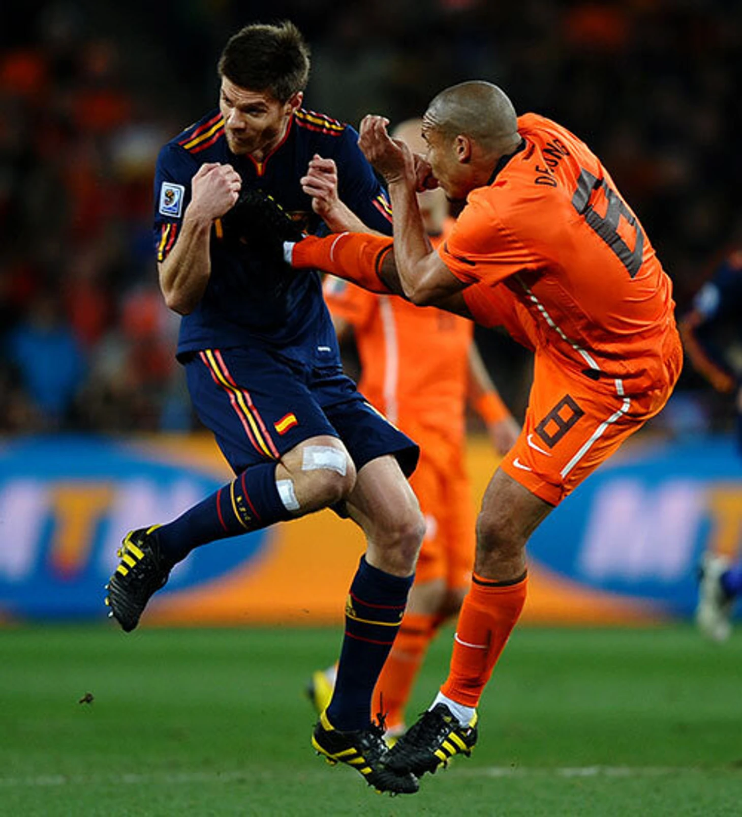 Испанцу пришлось вынести тот самый удар в грудь от голландца, за который Найджелу показали только желтую карточку.