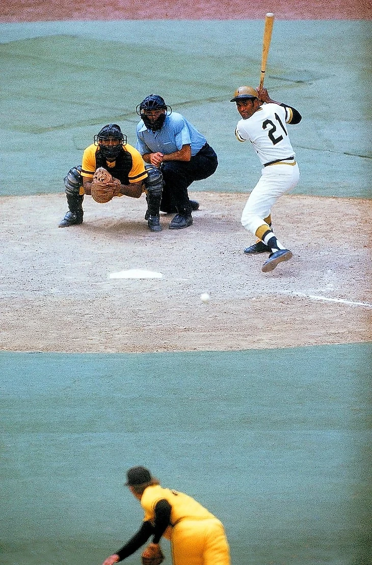 16 июня 1972 года. Звезда «Питтсбург Пайретс» Роберто Клементе отслеживает мяч от питчера «Сан-Диего Падрес». Сезон-1972 стал последним для Клементе – он погиб в авиакатастрофе в декабре того же года.