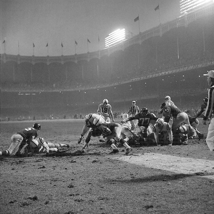 Считается, что именно этот матч запустил американский футбол на вершину популярности в США. Основная причина – игра транслировалась по ТВ и получилась максимально зрелищной – это был первый матч плей-офф НФЛ, исход которого решился после овертайма. «Балтимор Колтс» победили «Нью-Йорк Джайентс» 23:17, а матч вошел в историю под названием «Величайшая игра, которую когда-либо играли». Этот статус подтвердили в 2019 году, когда общенациональным опросом 66 представителей медиа матч признали лучшим за первые 100 лет лиги.