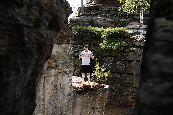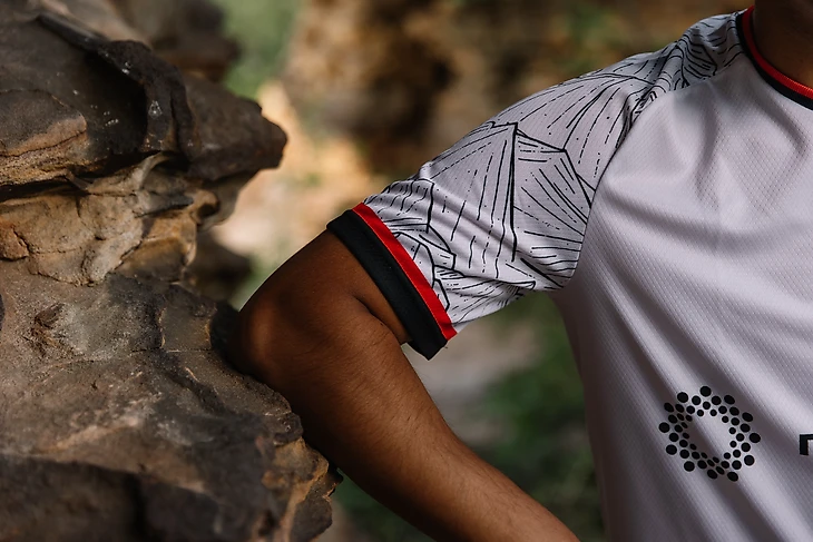 Гостевая форма вдохновлена уникальной географией Пермского края – Уральскими горами и полезными ископаемыми. Основной цвет – чисто белый, окантовка рукавов и воротника – в красно-черных цветах. На рукавах изображен паттерн Уральских гор. Съемка проходила в Каменном городе – ландшафтном памятнике природы в Пермском крае.