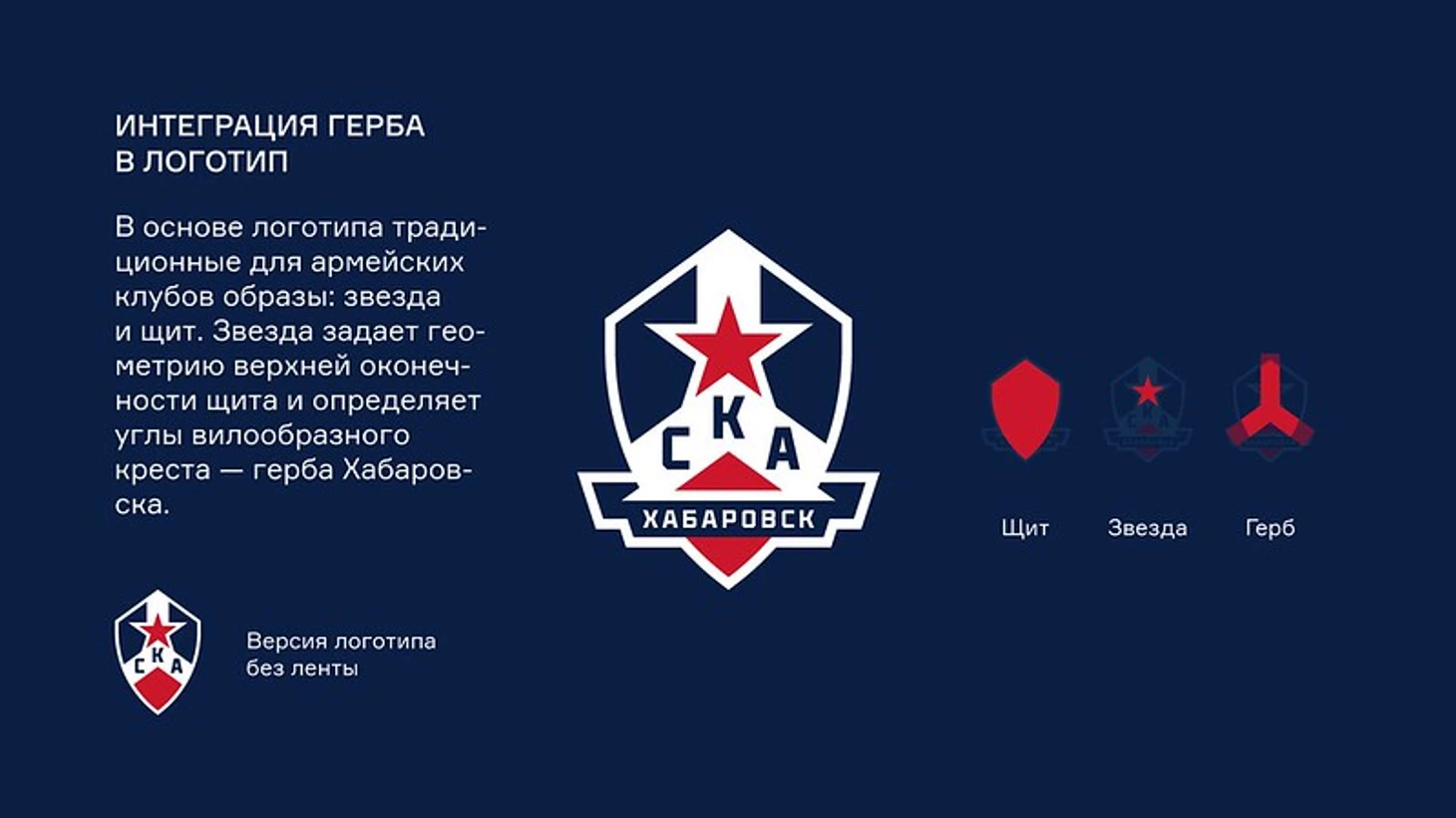 Герб можно интегрировать непосредственно в логотип. Например, в концепте логотипа футбольного клуба «СКА Хабаровск» вилообразный крест из герба региона, символизирующий реки Амур и Уссури, был встроен в геометрию звезды. Этот символ отсылает к армейской тематике и указывает на расположение города на карте.