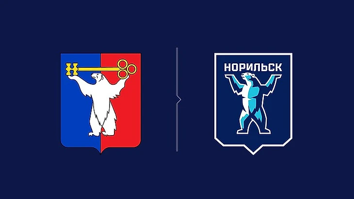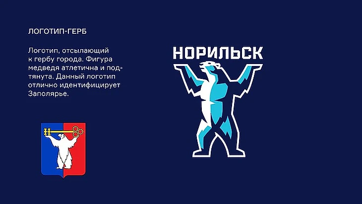 На гербе Норильска изображен белый медведь, который выглядит худым и не спортивным. Мы разработали дополнительный логотип, сохранив сюжет герба, но изменив образ медведя. Новый вариант – это атлетичный хищник с ледяным настроением, идеально подходящий для спортивного клуба. Такая версия лучше подчеркивает заполярное расположение команды и гармонично сочетается с клубными цветами.