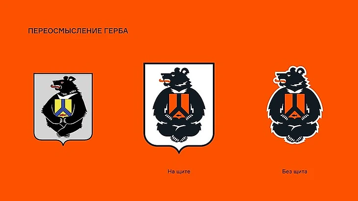 В логотипе ярославского «Шинника» используется герб города. Медведь на нем изображен в инфантильной манере: секира выходит за пределы щита, а общий стиль не соответствует ни геральдическим канонам, ни спортивной эстетике. В разработанном нами концепте герб был упрощен для использования в мелком масштабе – он эволюционировал в лаконичную и графичную пиктограмму.