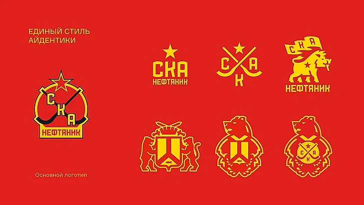 Для клуба «СКА Нефтяник» мы провели полный ребрендинг, включая переработку гербов города и края. Оба элемента были адаптированы под спортивную эстетику и стиль команды.