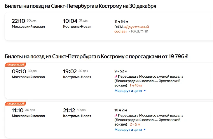 Ежедневно из Питера в Кострому отправляется фирменный двухэтажный поезд. Время в пути 11 часов 54 минуты. Прямого авиасообщения между городами нет, но вы можете полететь с пересадкой в Ярославле или Иваново. Из Ярославля до Костромы можно доехать на поезде, стоимость билетов от 660 рублей, время в пути от 67 минут.