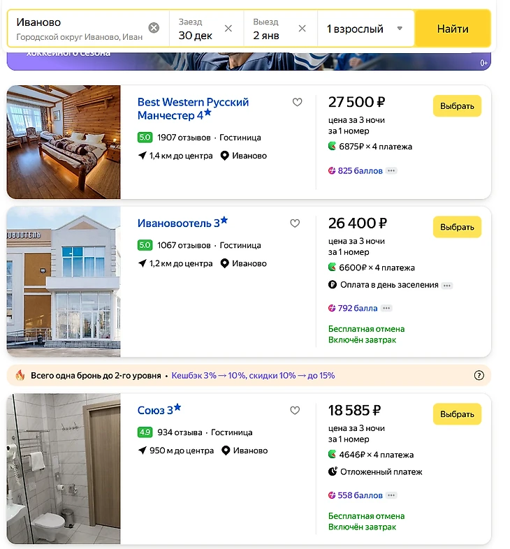 Стоимость проживания в Иваново отличается в зависимости от класса отеля. Самые низкие цены предлагает хостел «Созвездие». За три ночи с 30 декабря по 2 января придется заплатить 1779 рублей. В центральной части города можно найти отели с ценами от 6000 рублей. Например, четырехзвездочный отель «Турист» предлагает двухместный номер за 11 550. Дороже всего забронировать проживание в отеле «Алекс Роял», за три ночи стоимость 69 000.