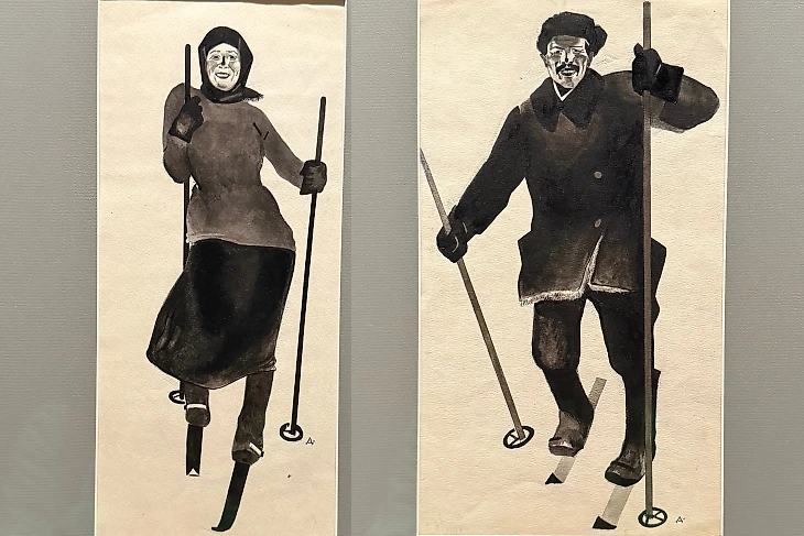 Рисунки лыжников для журнала «Безбожник», бумага, чёрная акварель. Первая половина XX века