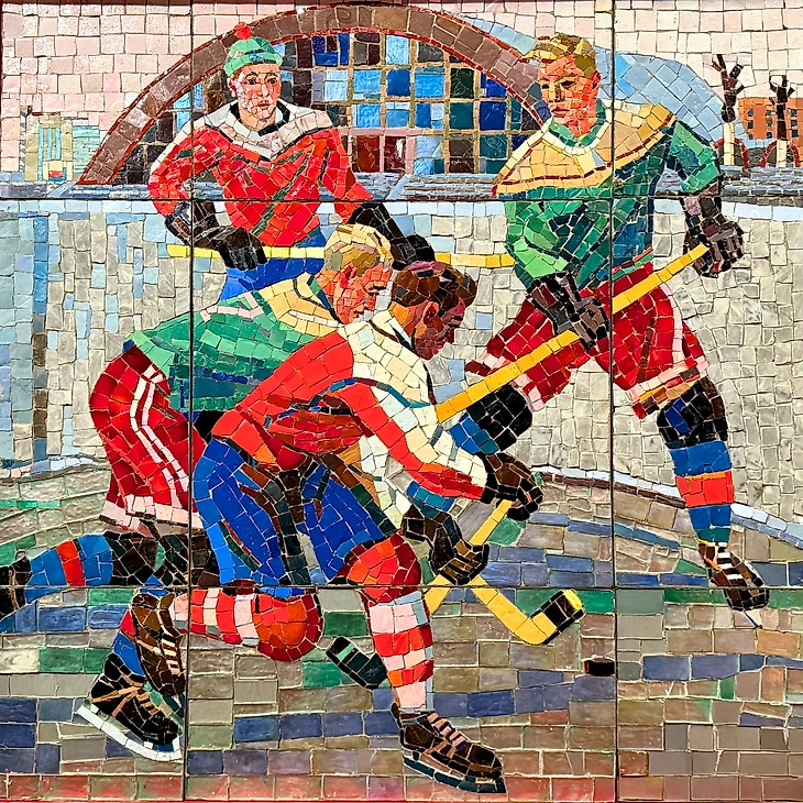 На выставке в Русском музее представлены такие знаковые работы, как «Раздолье» (на заставке этой публикации), «Сбитый ас», «Текстильщицы» и «Бег». Особый интерес вызывают крупноформатные мозаики «Утро» (1949) и «Хоккеисты» (1959–1960), которые впервые за 50 лет демонстрируются широкой публике.
