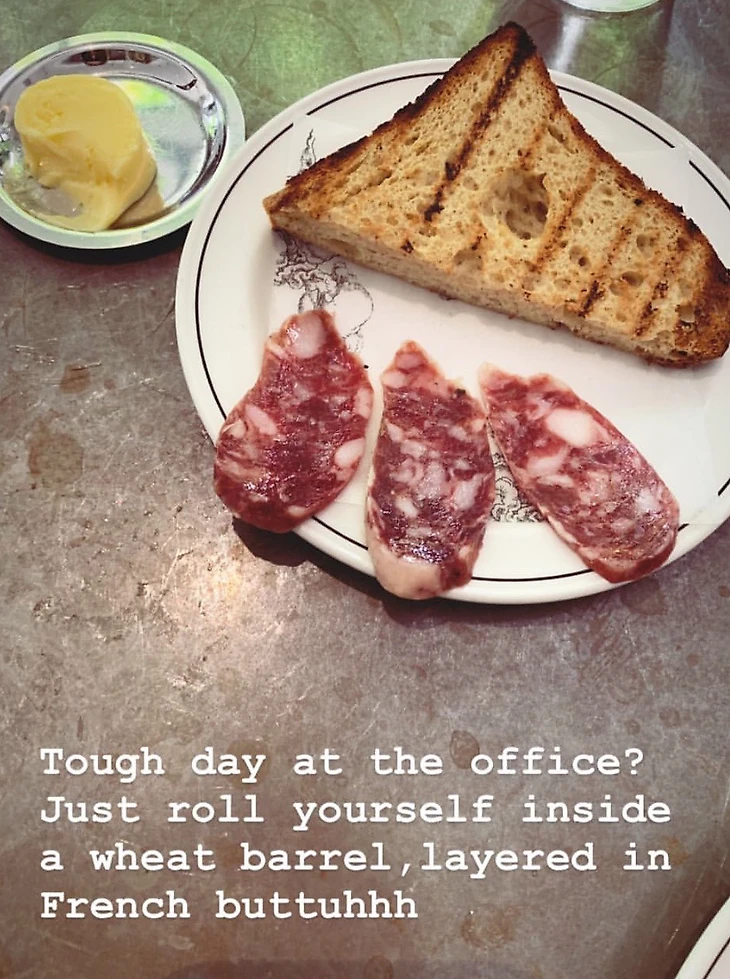 «Неудачный день на работе? Прыгай в бочку с пшеницей, выложенную французским маслом», – подписала 31-летняя Шарапова фото с едой.