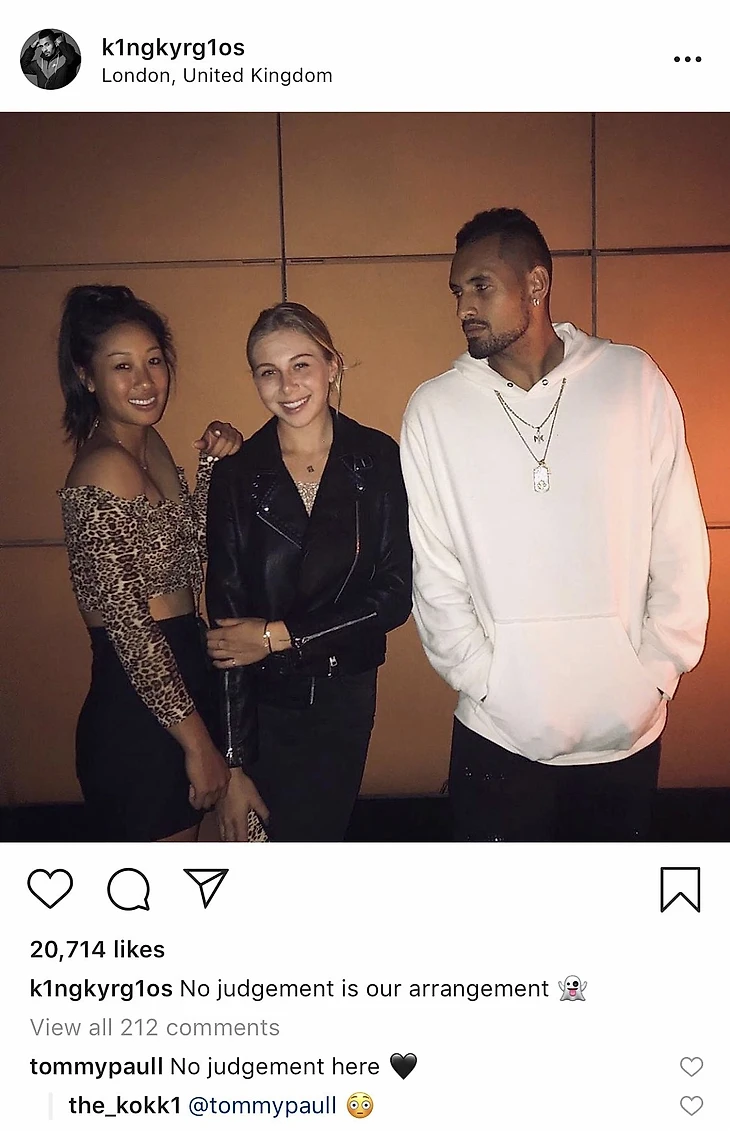 Также сегодня Кириос опубликовал свое фото с полуфиналисткой «Ролан Гаррос» 17-летней Амандой Анисимовой и шестой ракеткой Австралии 21-летней Присциллой Хон из лондонского ресторана Zuma с подписью «Наши условия – никакого осуждения». Позднее он удалил пост.