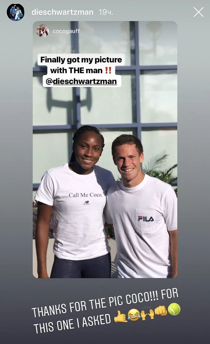 140-я ракетка мира 15-летняя Коко Гауфф в преддверии US Open запостила в инстаграме фотографию с Диего Шварцманом, подписав ее «Наконец сфотографировалась с самим Диего Шварцманом!».