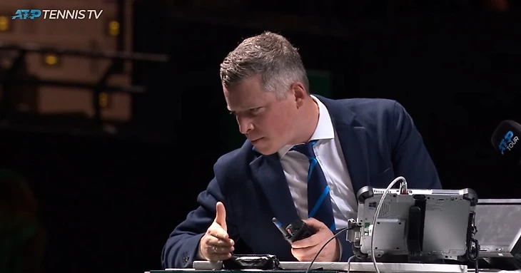 Британец, который по ходу партии вел с брейком, а потом в 13-м гейме – с минибрейком, посчитал, что на сетболе француза мяч после подачи задел трос и розыгрыш нужно было переиграть. Судья сказал, что прибор, фиксирующий касание, молчал. Эванс ударил ракеткой по тросу и сказал, что мяч издал такой звук, и судья должен был его услышать и без прибора.
