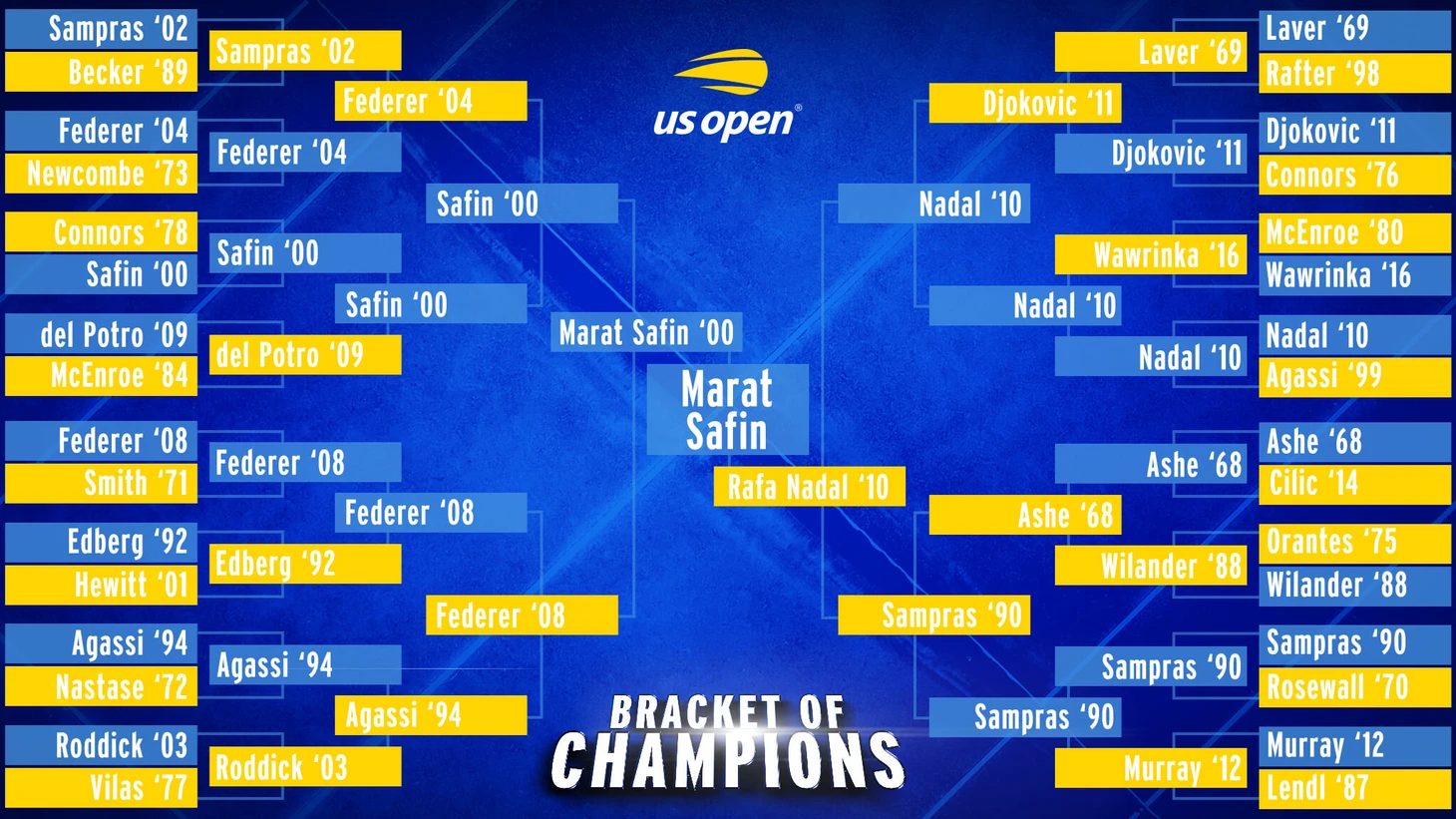 В виртуальном «Большом шлеме» стартовало 32 победителя US Open. Роджер Федерер, Андре Агасси, Пит Сампрас, Джон Макинрой и Джимми Коннорс попали в сетку дважды с чемпионствами разных лет. В полуфинале Сафин (2000) прошел Федерера (2008), Надаль (2010) – Сампраса (1990).
