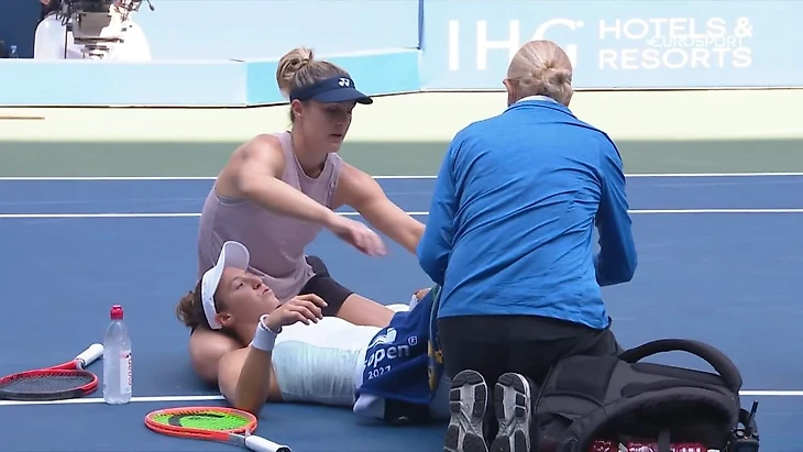 Стефани покинула корт на коляске. Сначала сообщалось, что идет медицинский перерыв за пределами корта, но потом официально объявили об отказе.