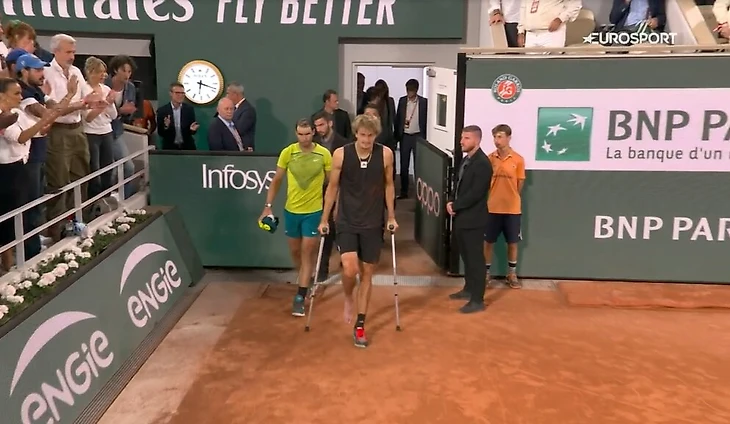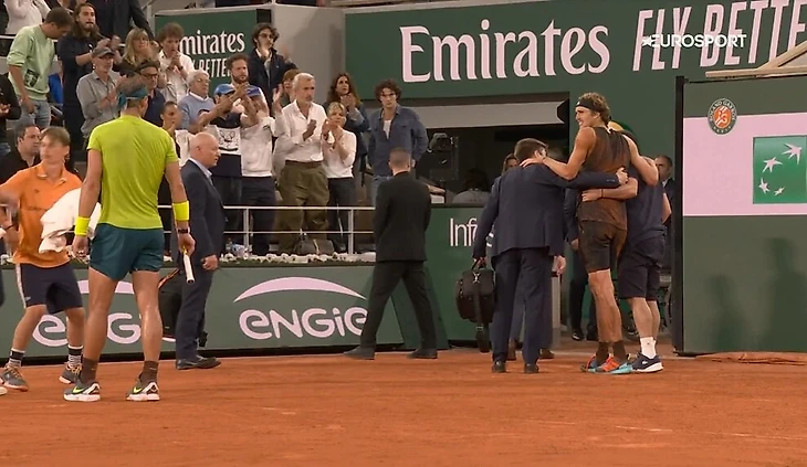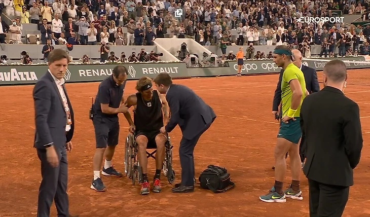 Зверев снялся с полуфинала «Ролан Гаррос» против Надаля – он подвернул ногу, и его увезли с корта на коляске