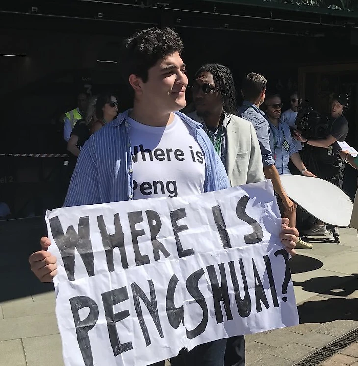 «Меня только что спустила по лестнице уимблдонская охрана за то, что у меня в руках был плакат «Где Шуай Пэн?» Один из охранников ударил меня головой об стену».
